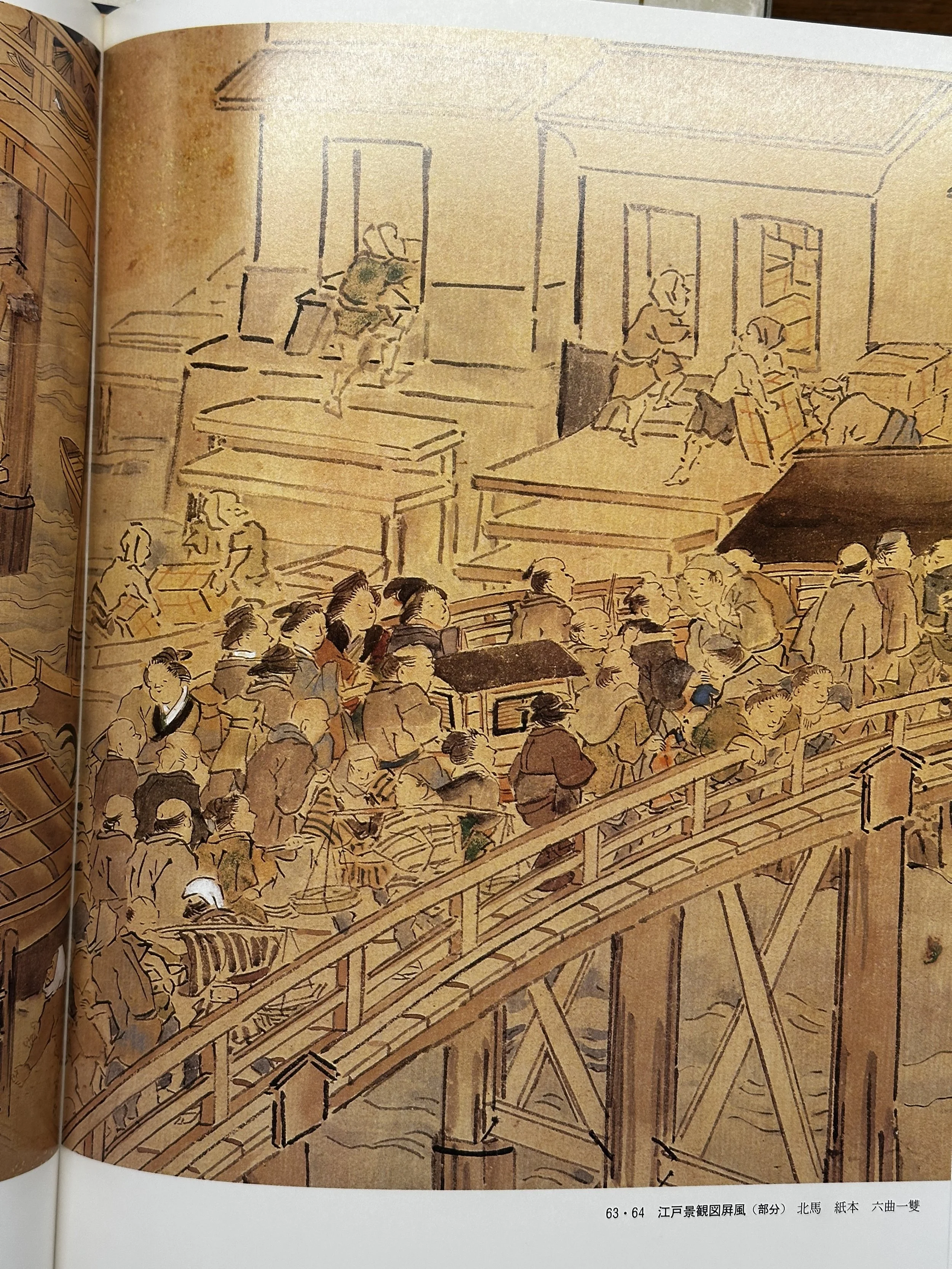The texts note a key characteristic of these screens: their ability to combine scale with precision. From a distance, the composition resolves into a vast panoramic field — a sweeping vision of Edo’s built environment, with bridges, riverbanks, and market halls arranged across the surface. But as one moves closer, that field dissolves into innumerable small acts, each rendered with quiet attentiveness. The grandeur of the whole is sustained by the exactness of the parts.