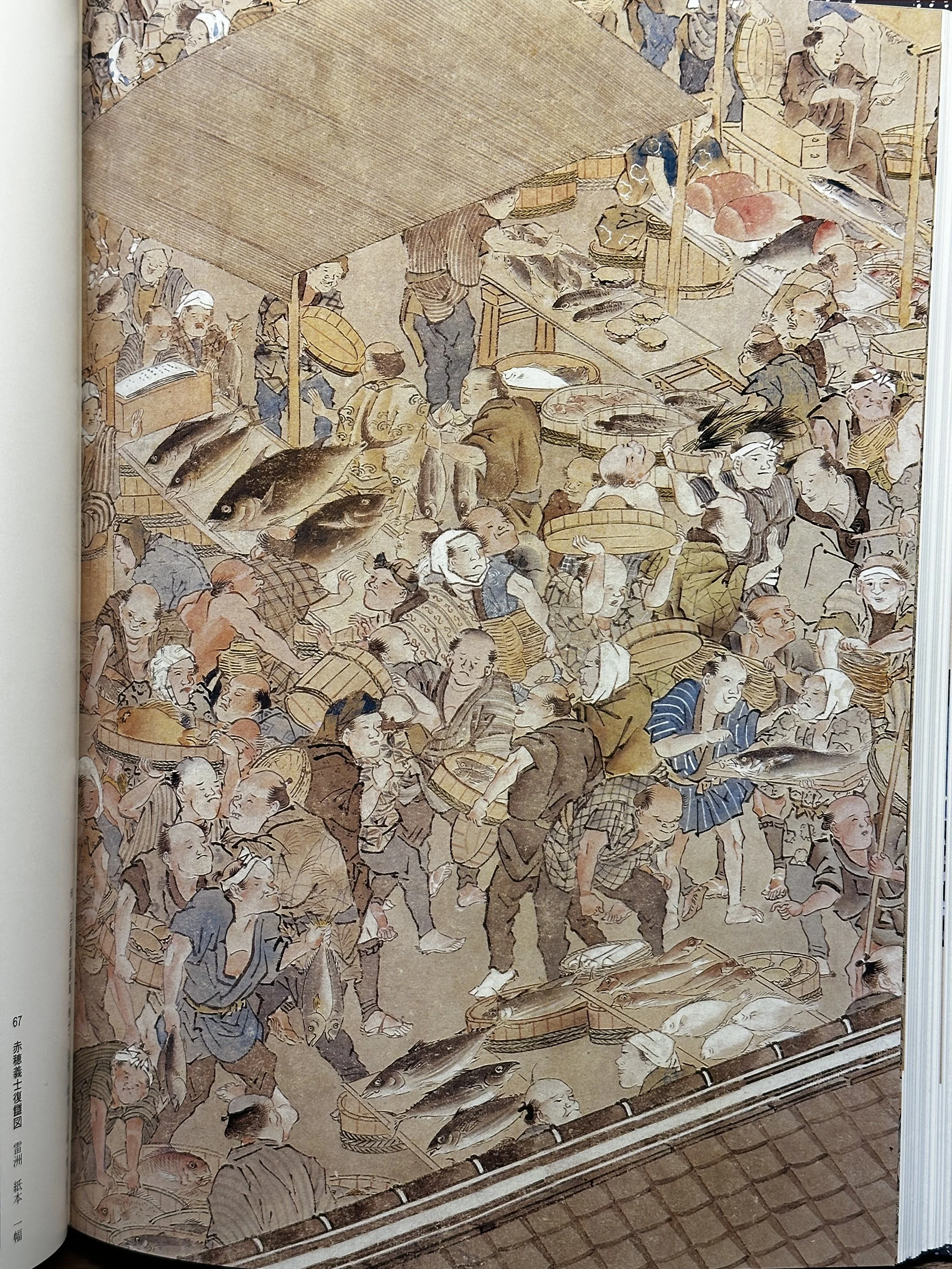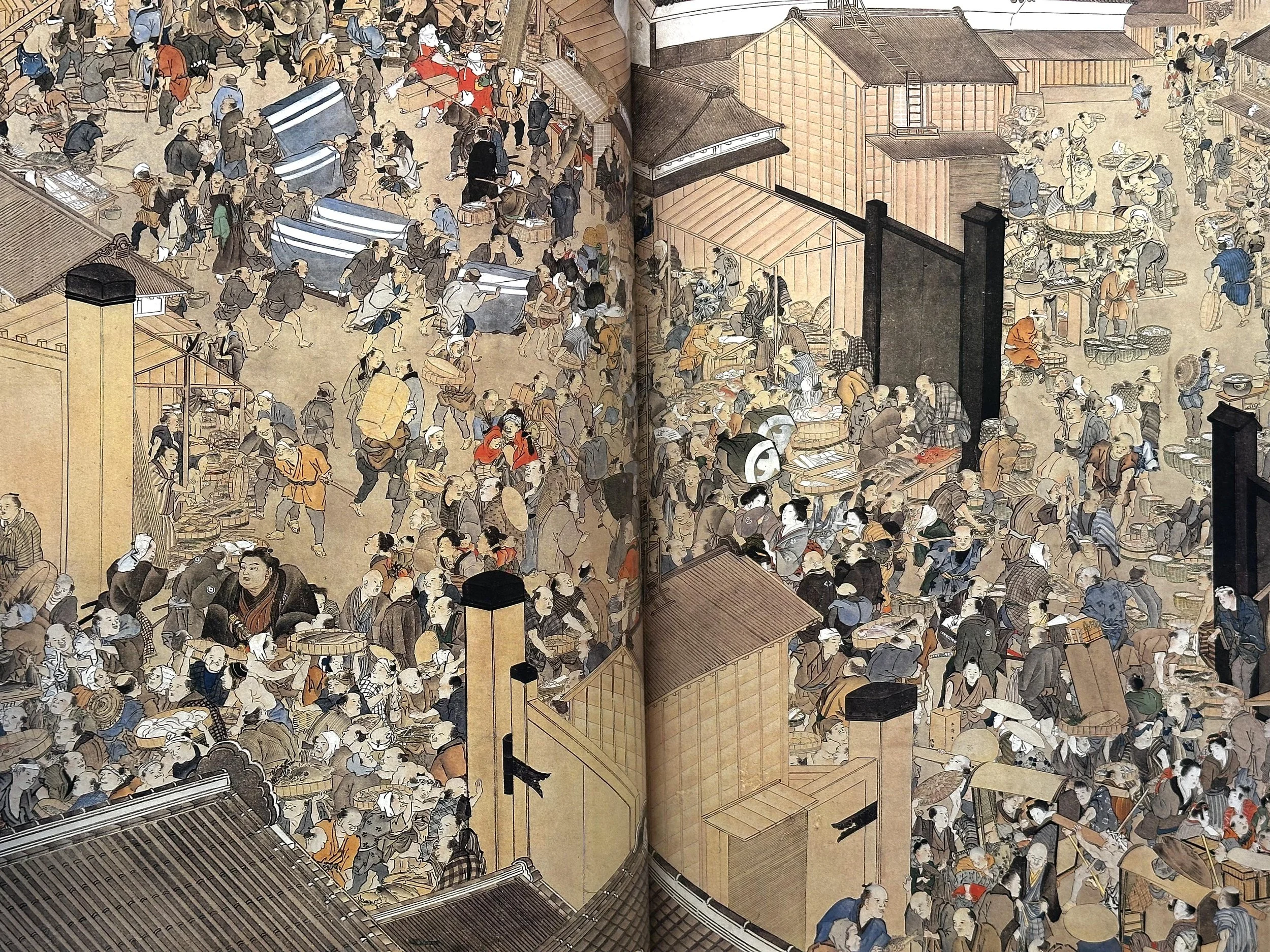 The texts in Nikuhitsu Ukiyo-e, Vol. 7: Hokusai (Shueisha, 1982) describe these works as part of the flourishing culture of genre painting — fūzokuga — in the late Edo period, when the daily life of townspeople became a subject of sustained artistic attention. This was not incidental. By the late eighteenth and early nineteenth century, Edo had become one of the largest cities in the world, and its commercial districts — including the great fish market at Uogashi — formed the beating heart of its economy. What we see in these paintings is not anecdote, but structure: the circulation of goods, labour, and attention within an increasingly complex urban system.