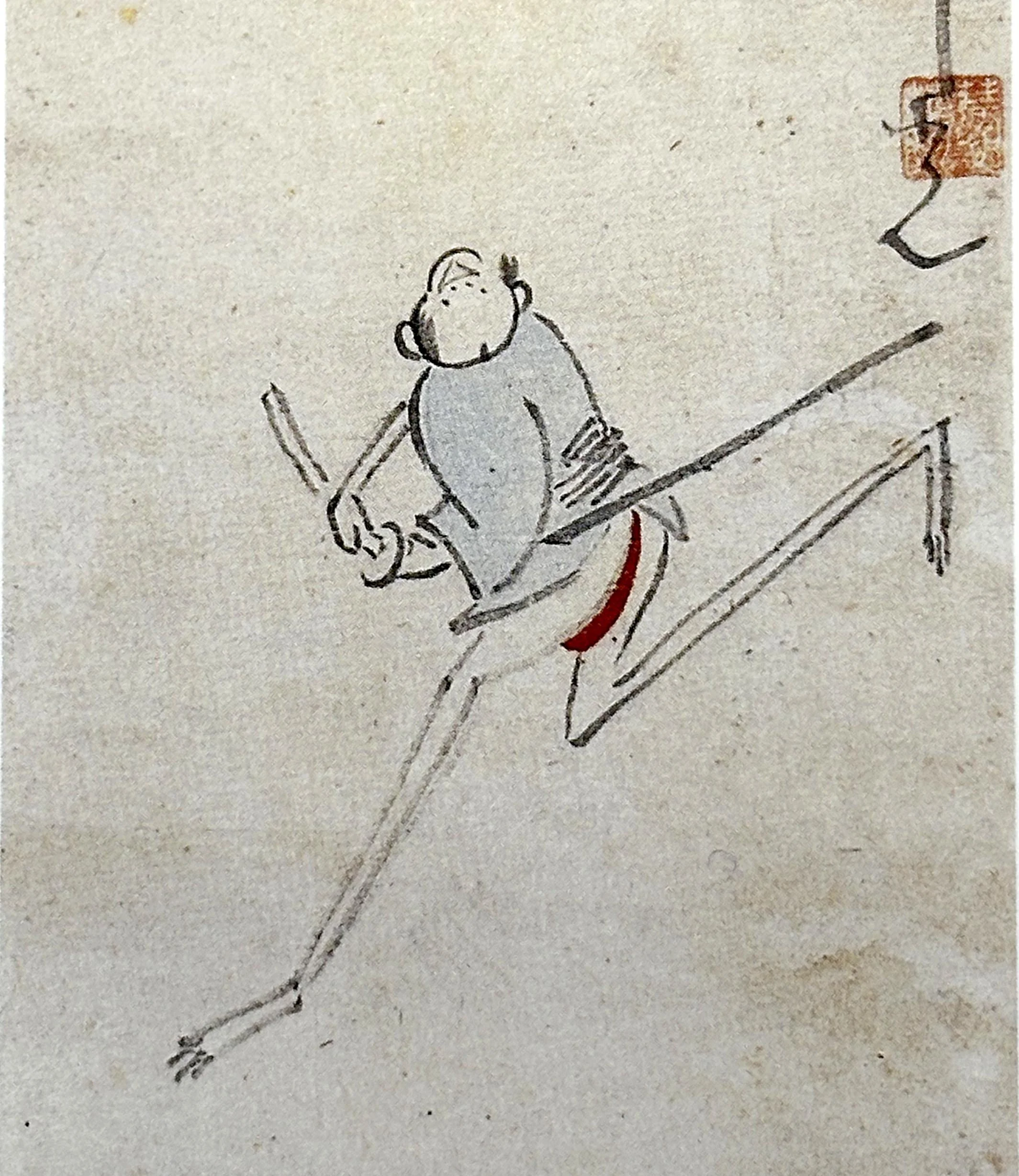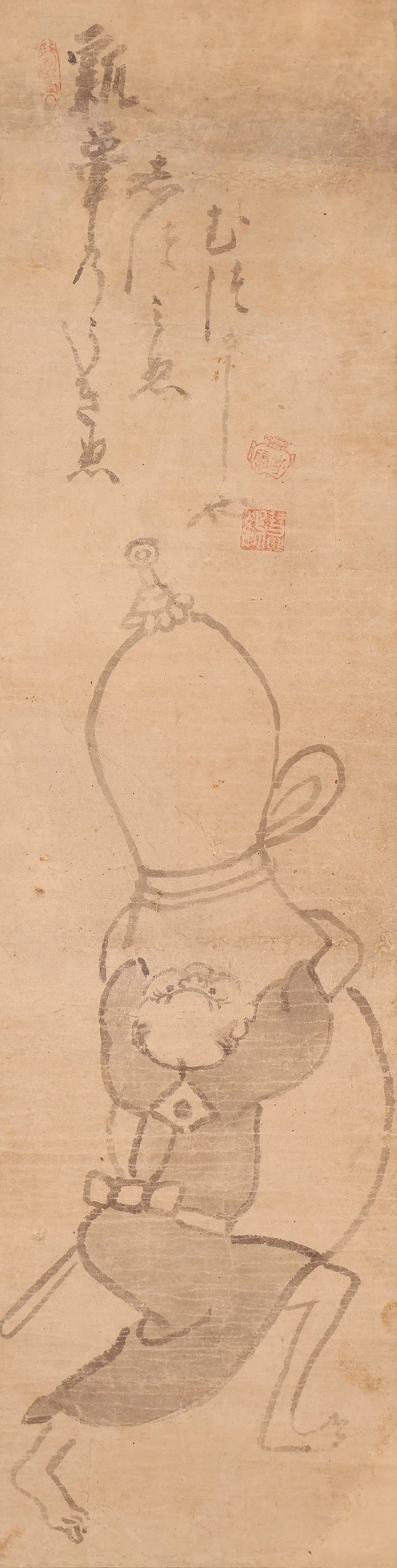 Consider a small hanging scroll depicting a samurai straining upward to grasp a large gourd. His body is twisted, viewed from behind; his head is thrown violently backward at an almost impossible angle. The brow and nose are reduced to a few strokes, yet the psychological state is unmistakable. Effort. Strain. Futility.