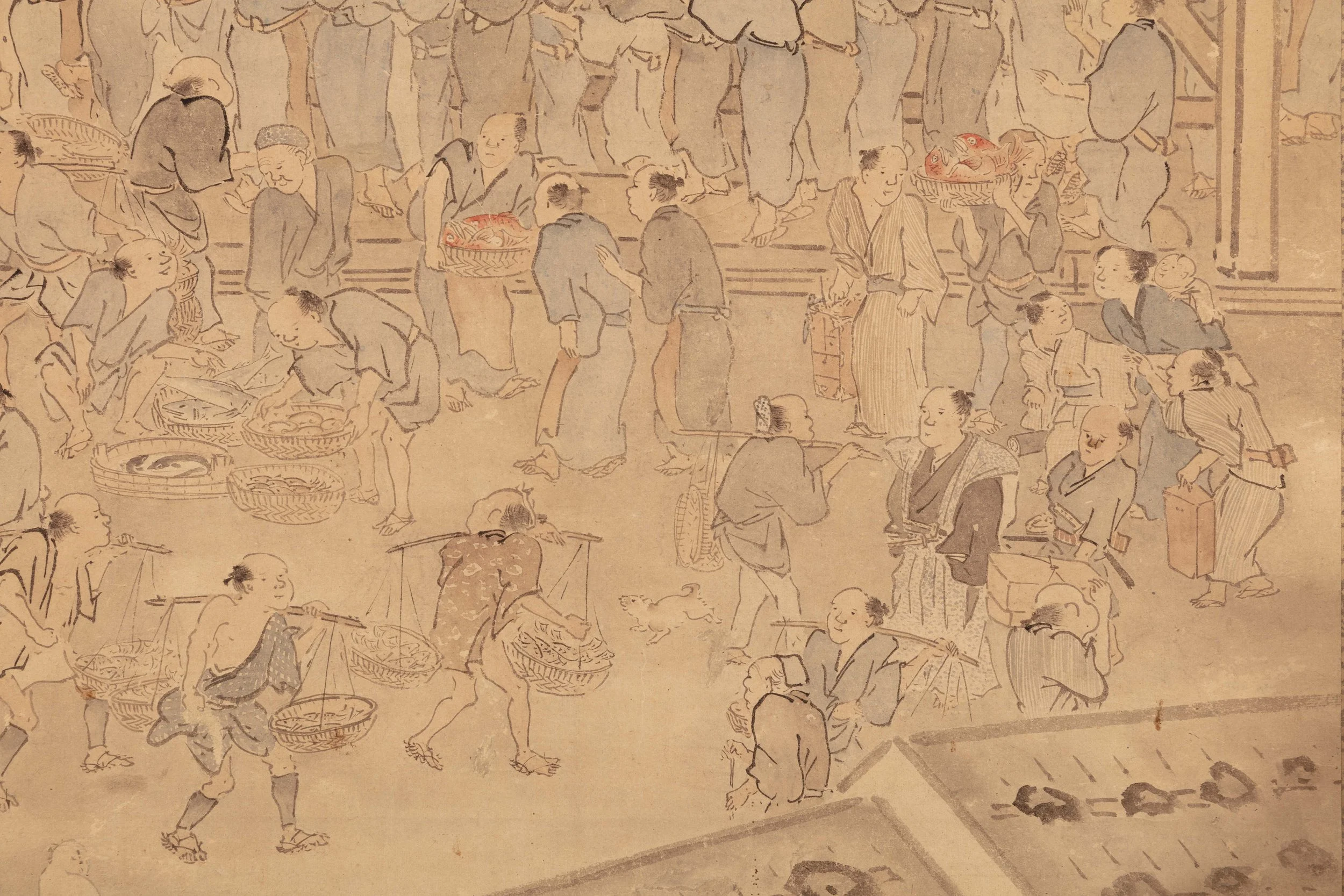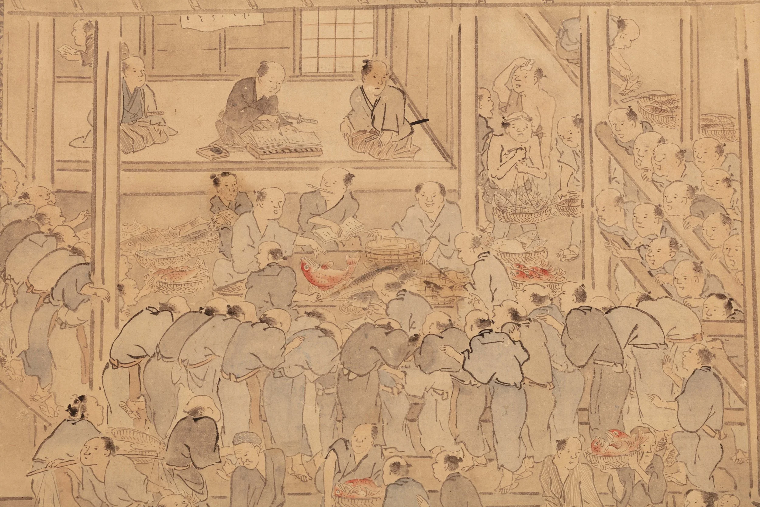 The scenes do not isolate dramatic moments. Instead, they accumulate detail. Figures press inward, overlapping, bending, negotiating space. Porters carry loads suspended from shoulder poles; clerks lean over ledgers; buyers crouch to inspect the catch. Fish appear not as symbols, but as objects of weight and exchange — laid out, handled, assessed. The crowd itself becomes a kind of organism, structured yet fluid, dense yet legible.
