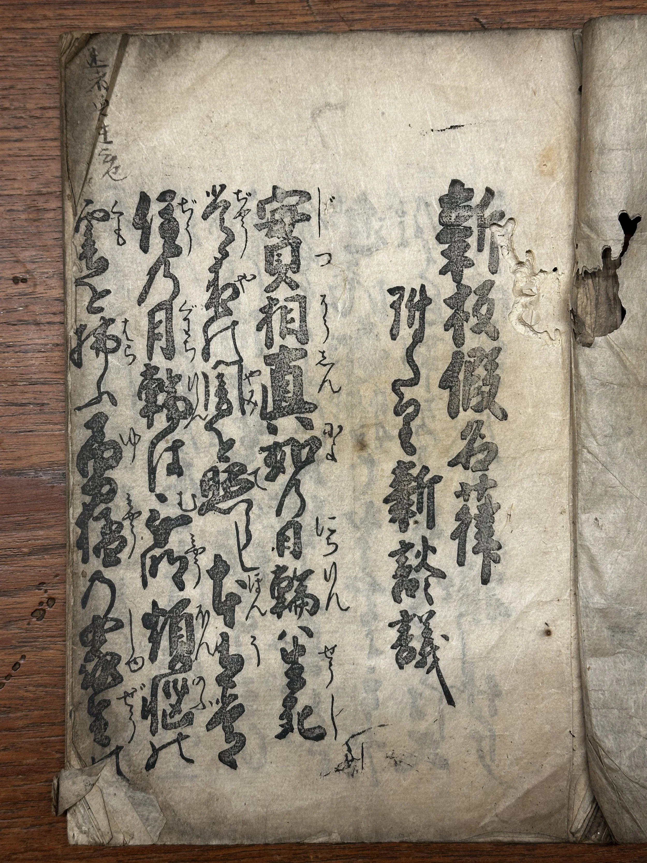 The title on the outer cover is worn and difficult to read in full, but enough remains to suggest that the book was originally presented as a didactic text of the “instruction for beginners” type — a common category in Edo-period publishing. However, a printed title page at the end of the volume appears to read 離相下巻抄 — “Abridged Notes, Lower Volume: Leaving Appearances.” This internal title is more explicitly Buddhist in tone, and suggests that the work may be better understood not simply as elementary instruction, but as a distilled teaching concerned with non-attachment to forms — the letting go of appearances.