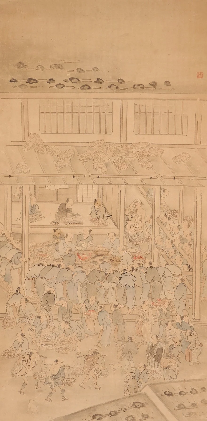 Hokuba, a direct pupil of Hokusai, appears to have absorbed the master’s linear vitality while directing it toward a more observational, descriptive mode. Where Hokusai often pushes toward invention and dramatic compression, Hokuba’s work tends toward accumulation — a careful registering of activity as it unfolds. This lends the present painting a distinctly documentary quality. The figures are not idealised or theatrical; they are engaged in the practicalities of trade — weighing, carrying, inspecting — their gestures economical and unselfconscious.