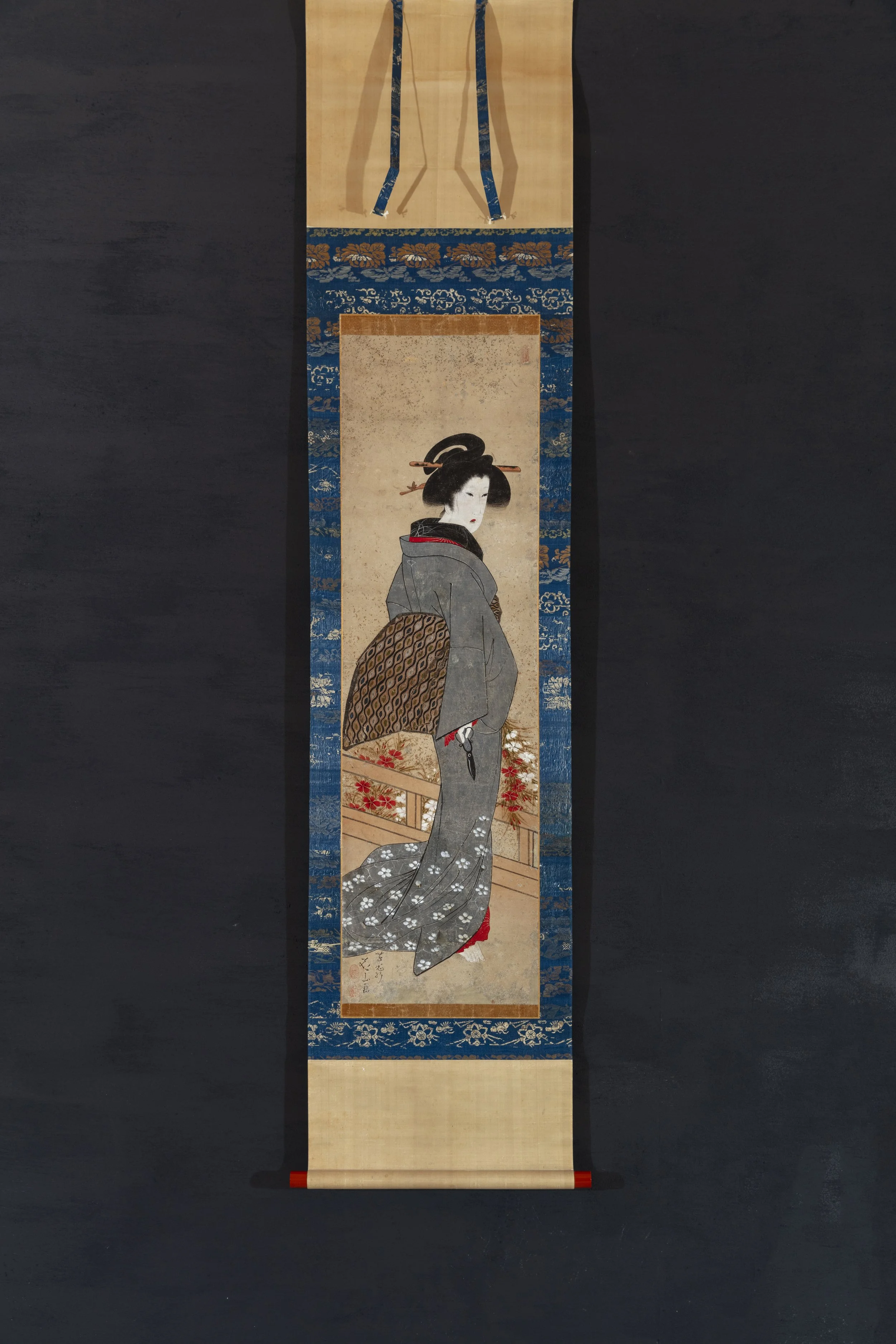 Stylistic elements including the soft grey palette, the use of luxurious materials (mica and an embroidered mounting), the floral vignette, and the tender modeling of the face align closely with the refined sensibility of the Kyoto–Osaka cultural sphere—the Kamigata region, often described as embodying “Old Capital” taste—though Edo ateliers produced comparable works. Whatever its precise workshop origin, the scroll beautifully crystallizes an early nineteenth-century urban ideal: artisanal grace, fashionable textiles, and a whisper of private interiority held delicately at the edge of view.