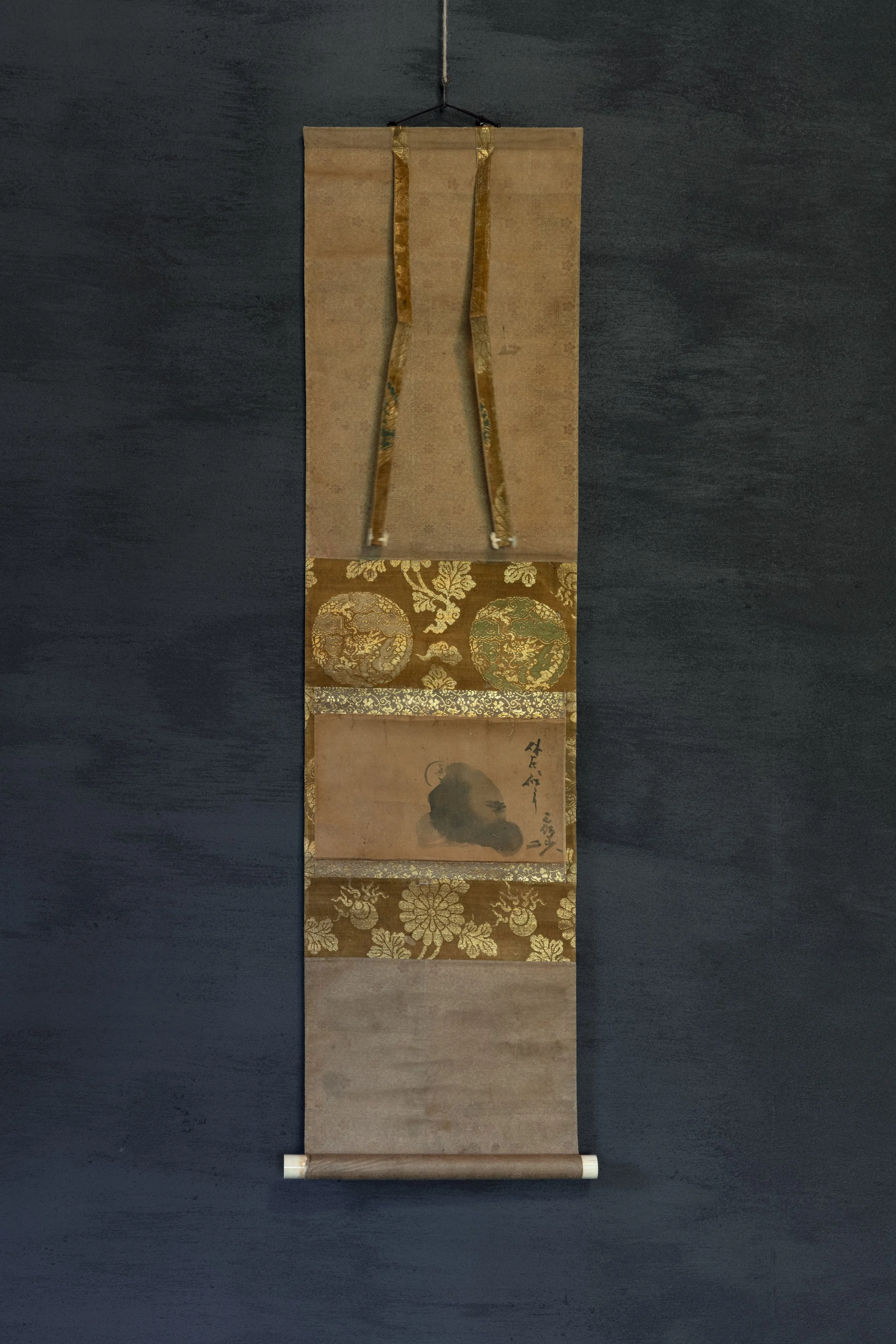 The present brocade mounting—soft brown silk woven with chrysanthemum and peony roundels in gold—accords with that moment of renewal, when portraits of Rikyū and Sōtan were reverently refurbished for alcove display. Subdued rather than ornate, it reinforces the painting’s inward gravity.