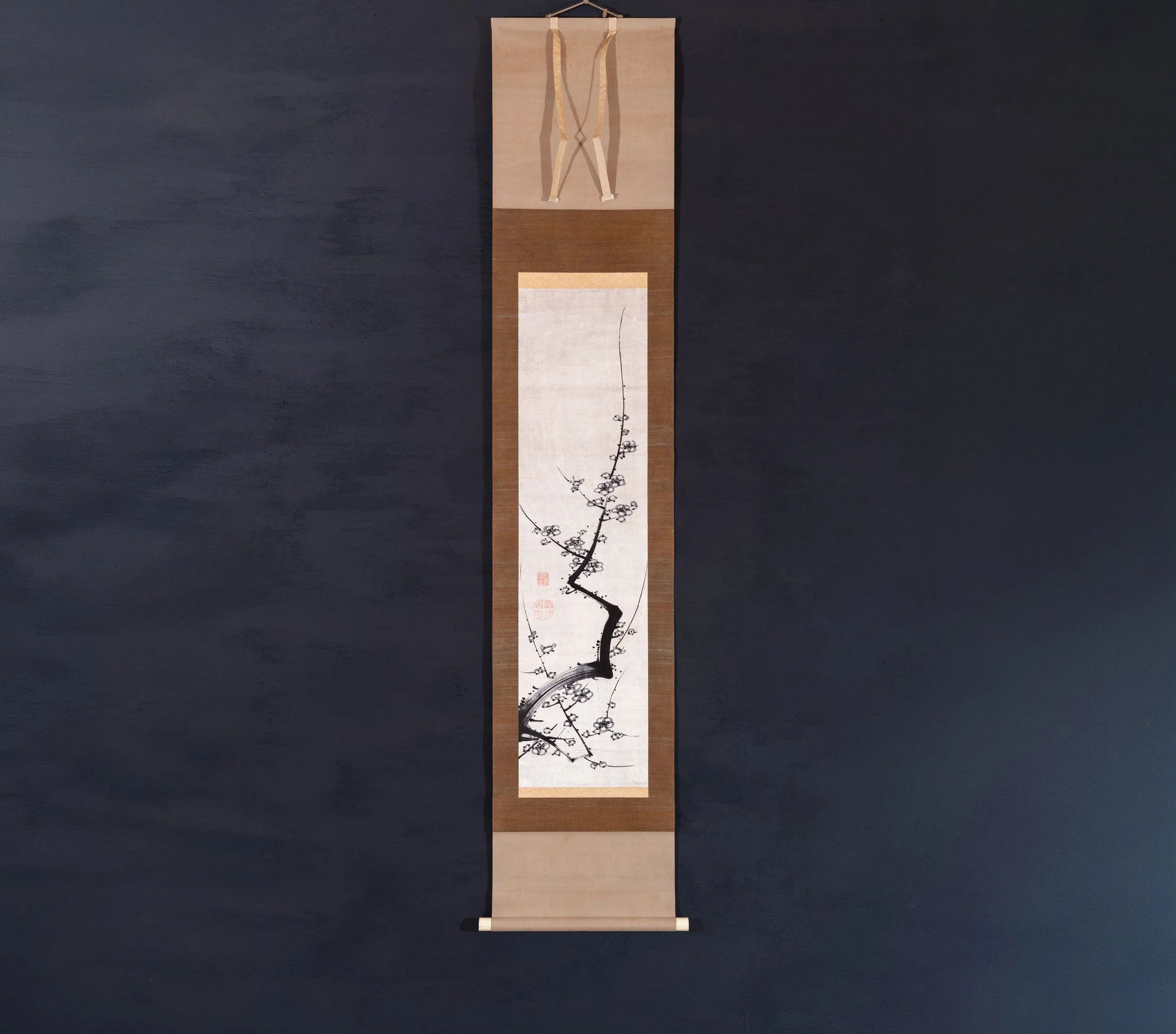 Within Jakuchū’s oeuvre, plum branches in monochrome ink occupy a distinct register. Unlike his celebrated polychrome birds and flowers, these works pursue reduction rather than accumulation, testing how little is required to sustain vitality. The plum—associated with resilience, early flowering, and disciplined endurance—becomes here a vehicle for brush practice itself. Executed with such speed and clarity, the painting is only fully realized through attentive viewing: the painter paints, but it is the act of seeing that completes the work. The image does not idealize its subject; it enacts it, unfolding as an event between hand, ink, and viewer.