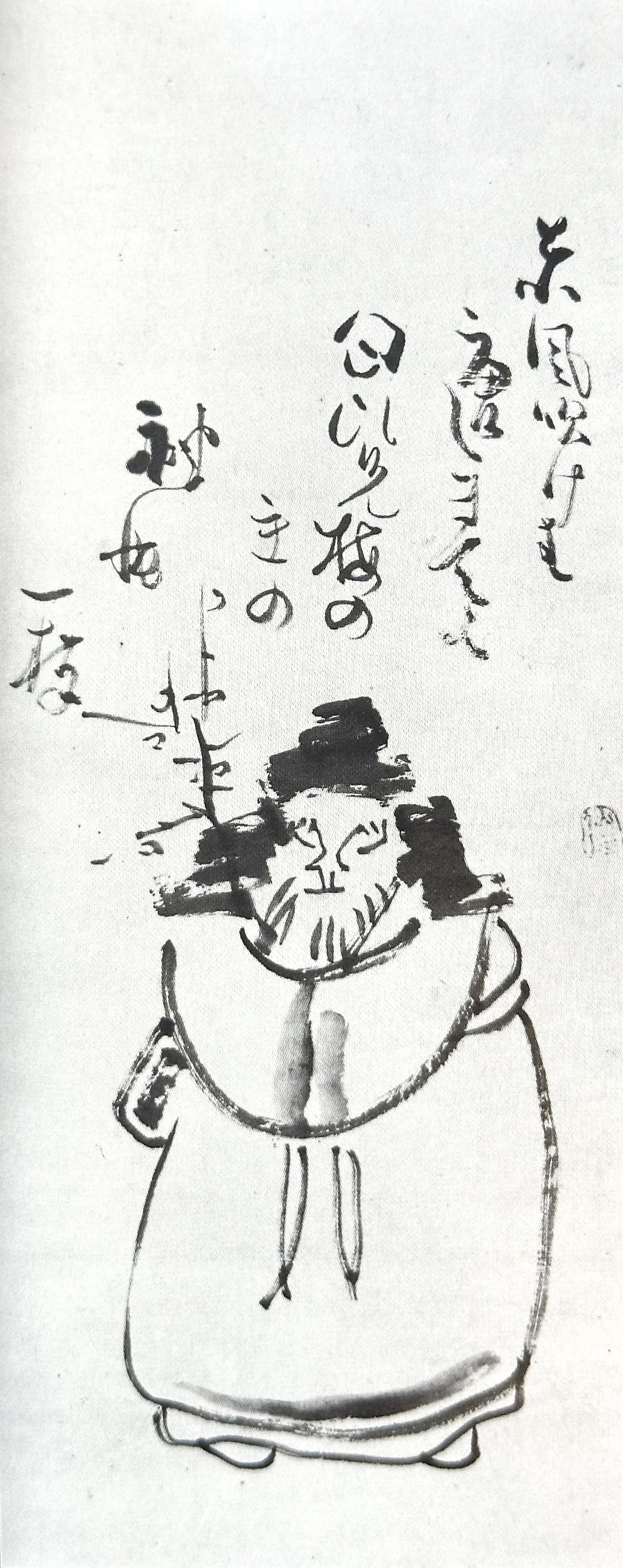 This subject held particular meaning for Sengai Gibon (1750–1837). Sengai spent much of his life in Kyushu and his later years in Dazaifu, the very place of Michizane’s exile and the center of Tenjin worship. For Sengai, Tenjin was not only a historical or religious figure but a local and personal presence — a scholar in exile, a poet, and a cultural figure associated with perseverance and learning. Sengai, himself a Zen monk, calligrapher, and teacher who often lived outside the main centers of power, seems to have felt a deep affinity with this figure. In Sengai’s hands, Tenjin is not portrayed as a distant deity but as a gentle, human presence: a travelling scholar wrapped in robes, holding a simple branch of plum blossom. The painting thus combines humour, humility, and scholarship — qualities that define Sengai’s Zen painting as a whole.