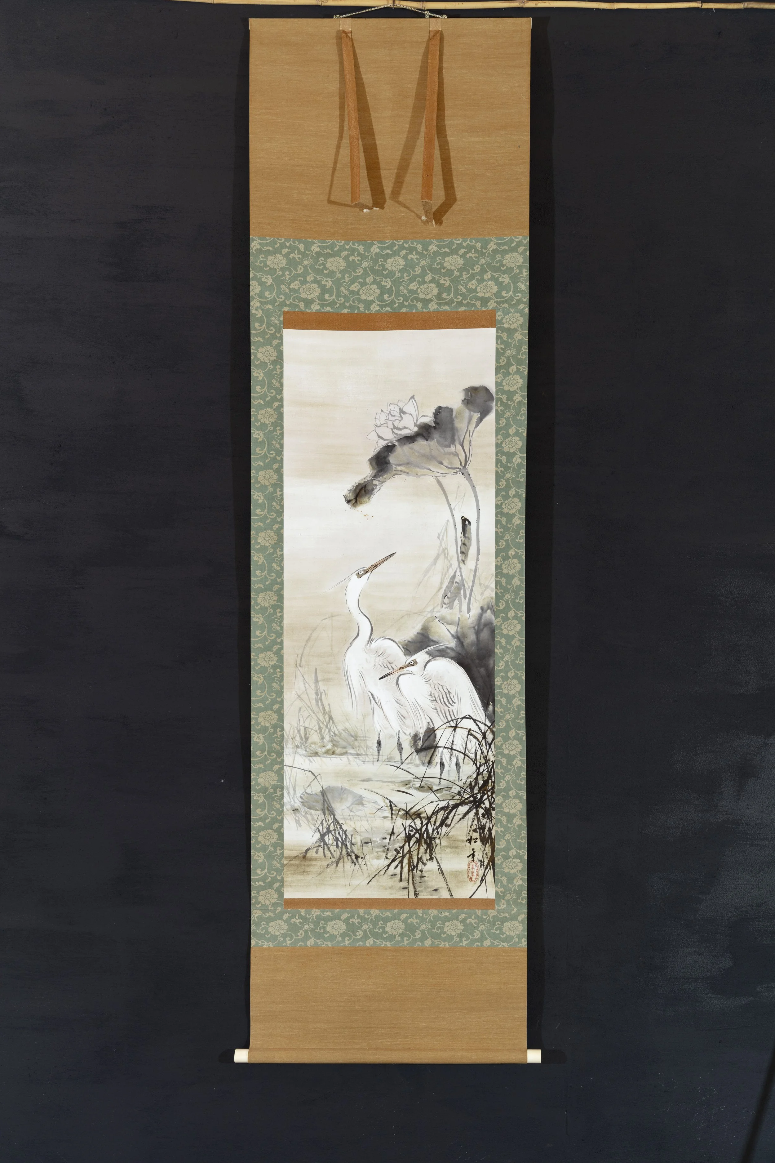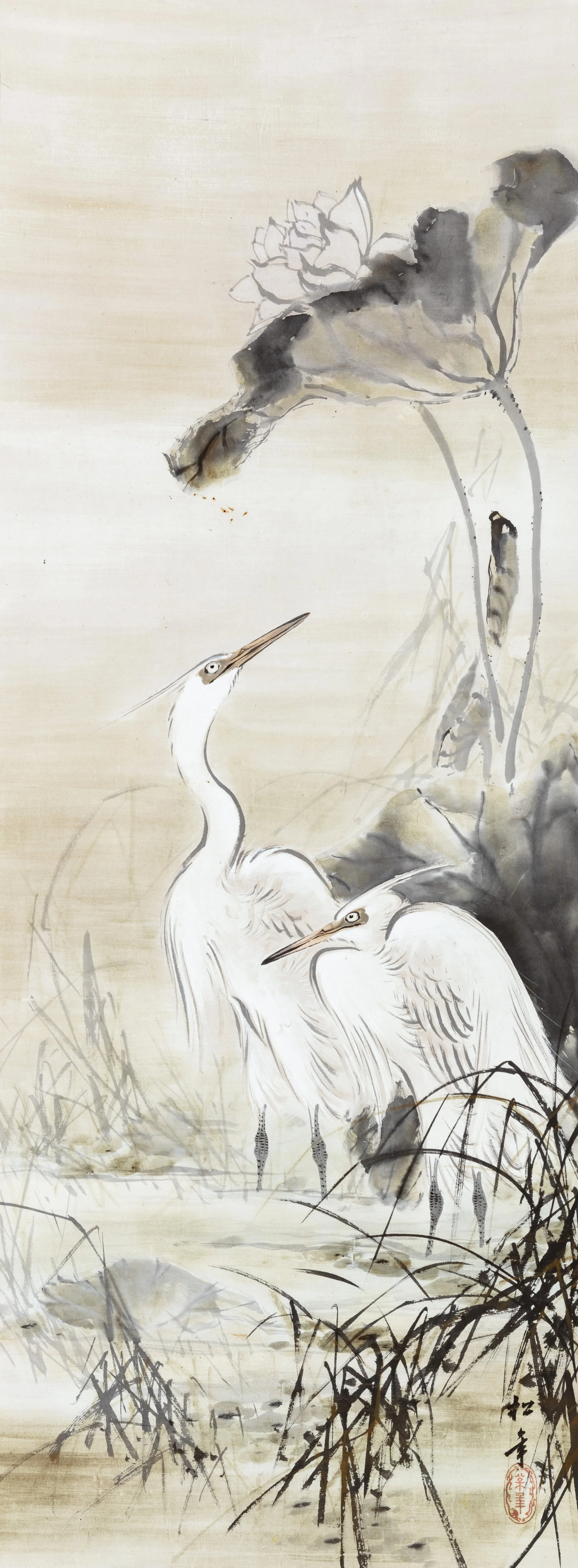 This elegant hanging scroll presents a pair of white herons standing among reeds beneath a flowering lotus, a subject deeply rooted in East Asian pictorial tradition yet here interpreted with the refined sensibility of the Meiji period. The composition is asymmetrical but carefully balanced: the upward reach of the lotus stem and bloom draws the eye vertically, while the two birds anchor the lower register, their bodies rendered with quiet authority and restraint.